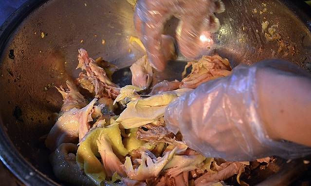 历经三代传承的手撕鸡一定要手撕,这样才能不破坏鸡肉本身的纹理,少流失鸡肉的汁液,吃起来更有口感