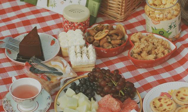 草地上是在野餐或者拍照的人