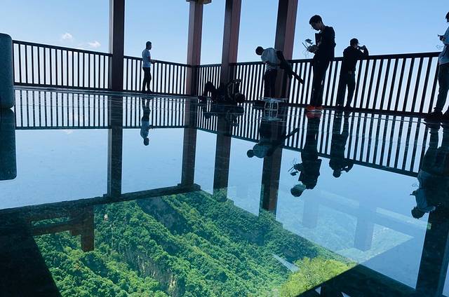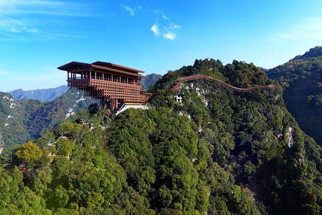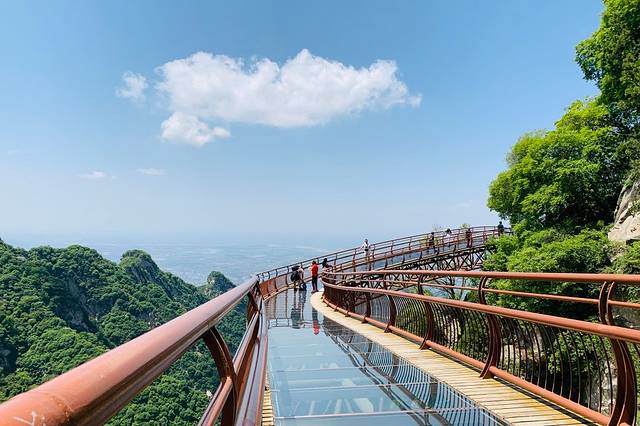 四面镂空的设计,抬眼望去是广阔无垠的蓝天白云,低头皱眉是层峦叠嶂的山川河流,高处不胜寒的感觉油然而生,惊险又不失乐趣。蟠龙之脊,云中栈道当你乘坐索道经过漫长的通道长吁一口气时,迎接你的是高耸而陡峭的悬崖绝壁之上熠熠生辉的玻璃栈道。湛蓝悠远的天空,一望无际,白云清淡,安静地飘在空中,蓝白、倒影交织,是童话里通往仙境的天空之桥。
