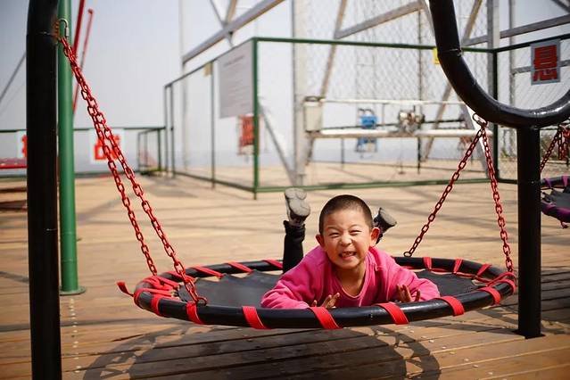 难得不用拘在家里可以出来透气的小朋友们,此刻铆足了劲儿疯玩儿。秋千上、碰碰球里、蹦床上,几乎每个可以撒欢的地方都被孩子们占山称王。