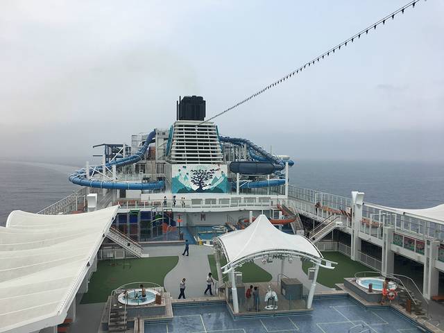 這裏就是世界夢號的甲板了,有泳池、水上滑梯,還有滑梯後面的球場和Mini Golf場地。