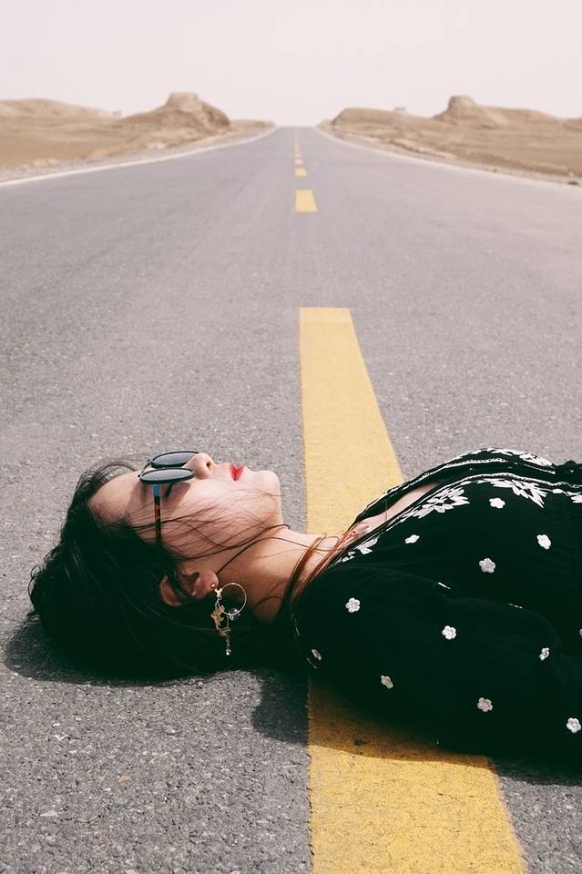 看见我,说,怎么穿了条裙子,上车换条裤子,这样在公路上出的片子才比较好看。