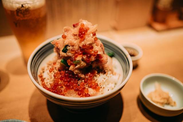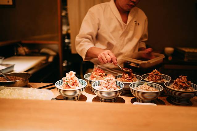 等了大概半个小时,终于空出来四个位置,我们点了2份“松”2份“竹”,落座后服务生端上热茶和鲷鱼刺身,可以一边吃,一边欣赏整个海鮮丼的制作过程。先将各类海鲜切成丁,撒入调味料搅拌,再填到米饭上,最后按照梅、竹、松、特上的区别分别撒上鱼子或海胆。