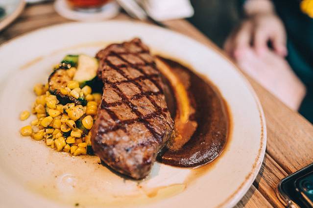 澳洲西冷牛排肉质软嫩,搭配黑蒜泥酱、奶油甜玉米粒,特别好吃!