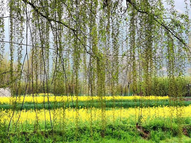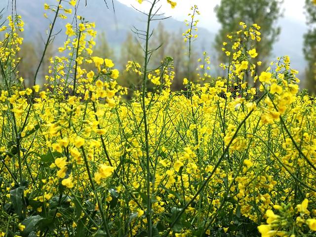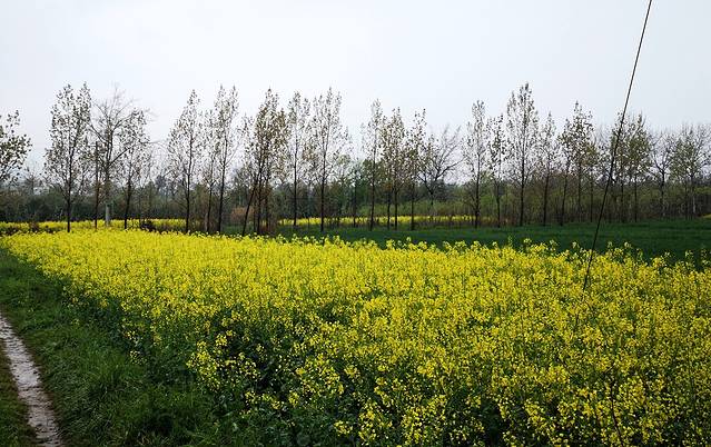 路旁大片的油菜花开了,花黄叶绿,一朵朵黄花犹如蝴蝶纷飞,若不是田埂泥泞,很想走在乡间的田野上。