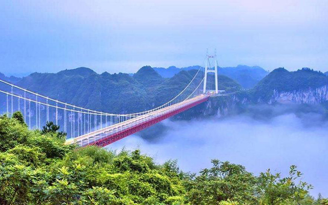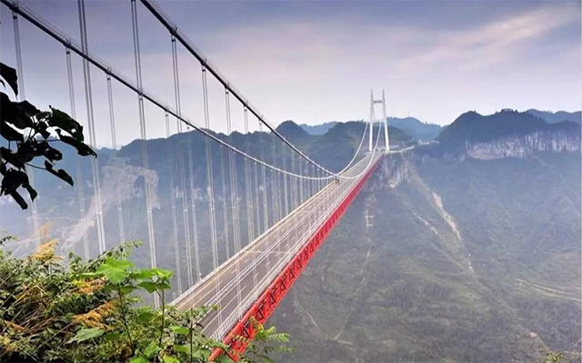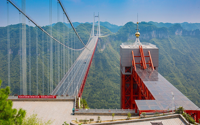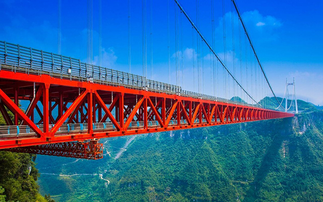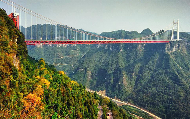 中国湖南矮寨大桥的主跨长度居世界第三、亚洲第一。一个8字形弯道,形成26截近乎平行的路面,是当之无愧的世界公路史奇观。