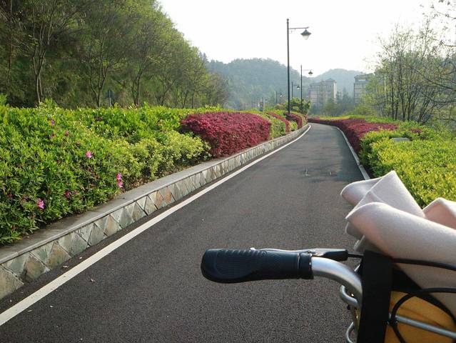 开始骑行了,路上的人不是很多,有人租的多人自行车。湖边有很多自行车专用道路。