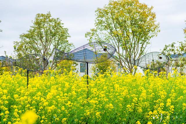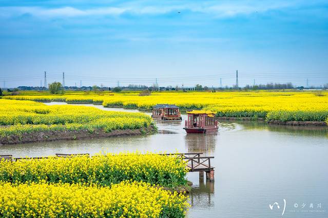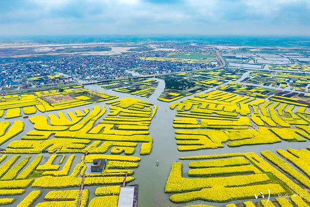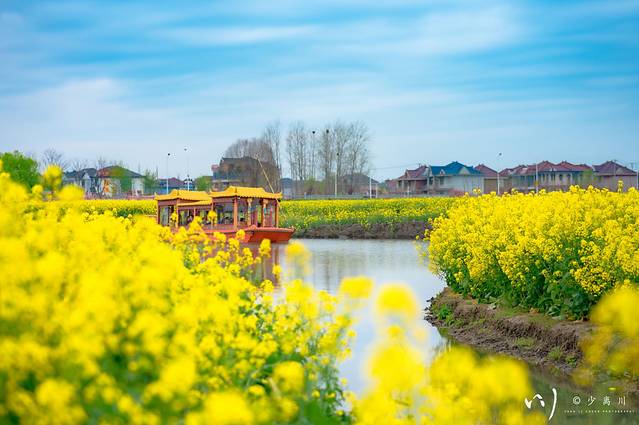 水中有小船悠悠荡过,花田、小岛、流水、乌篷船,和谐地交织在一起,汇成一幅以金黄色为主色调的绚丽画卷……
