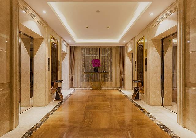 以夺目的吊灯为中心呈对称设计,上下结构有着圆润的曲线美,地板、天花板与墙壁在色系上相互融合