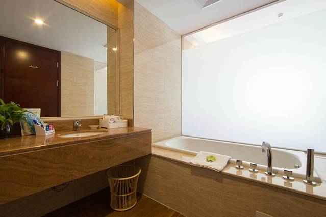 浴缸镶嵌在整面窗下,延展了淋浴空间,洗漱台也呈商务模式