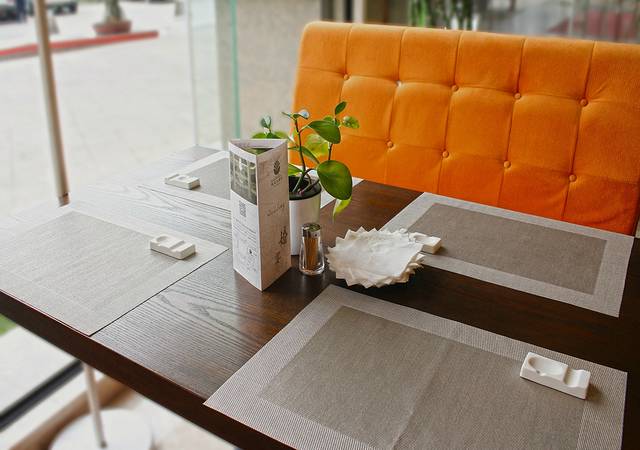 餐桌特意设置在靠窗处,桌布、纸巾及绿植等摆放再显装饰细致
