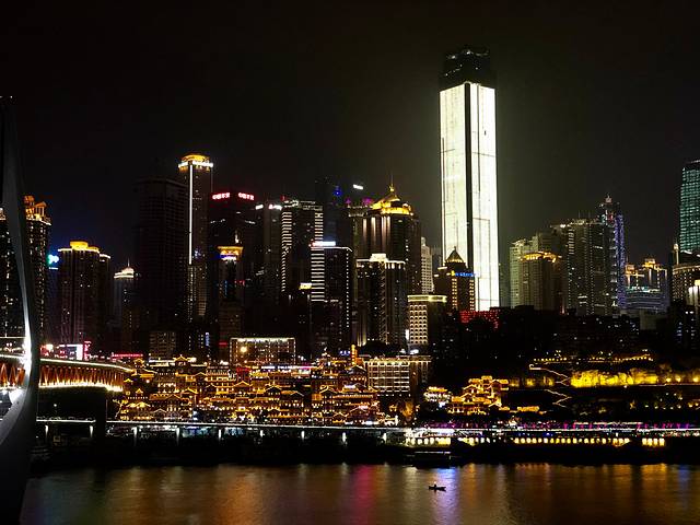 洪崖洞是逛山城老街、观赏两江风光、品尝当地美食的好去处,具有巴渝特色的山地吊脚楼建筑群仿佛置身于<千与千寻>的汤屋中,夜景只能用震撼来形容,感觉照片并不能体现出它的十分之一的美。最好的拍摄角度是走到千厮门大桥上可以拍到整个洪崖洞的全貌,可惜我们去的时候因为人太多限流不给上桥了,只能走另外一座嘉陵江大桥,这座虽然远但勉勉强强也还是能拍到。
