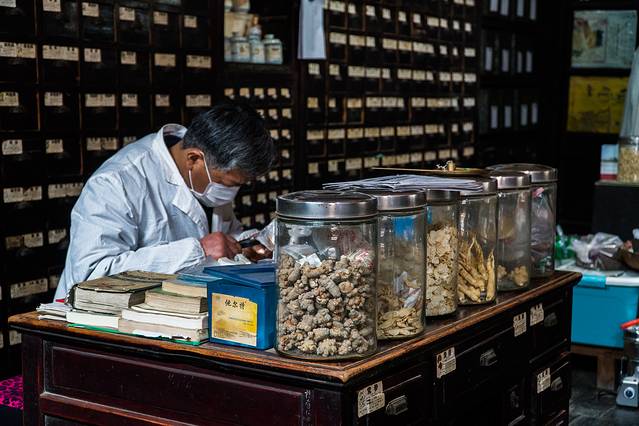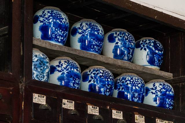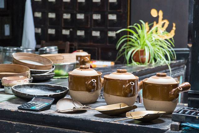 再仔细观察药铺,你会发现,店铺还传承了古老的前店后作模式。即前面是经营药材的药铺,后边是晒药制药的作坊。而且药铺的风格居然是石库门,满屋的金字牌匾,高高的黑漆柜台,还有将近200平方米的店堂地面铺设了当年的进口彩色釉面方砖,主次三个柜台饰以进口青花釉面方型瓷砖。连用戥子称药,碾槽、捣桶,药铺的一切,全都依照原来的样式保存完好。凸显了药铺的深厚文化底蕴。