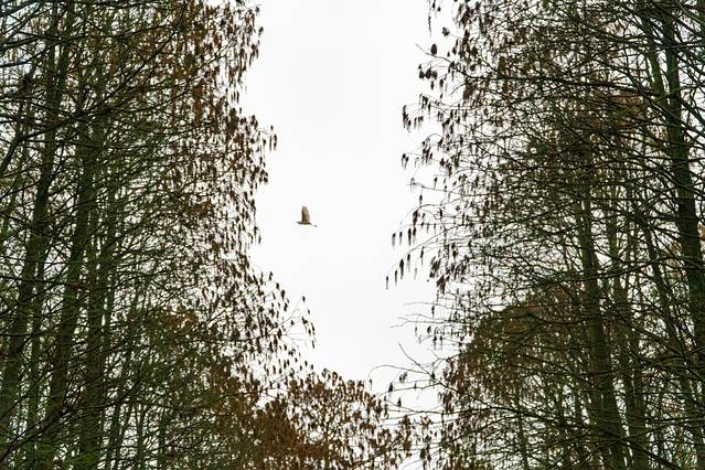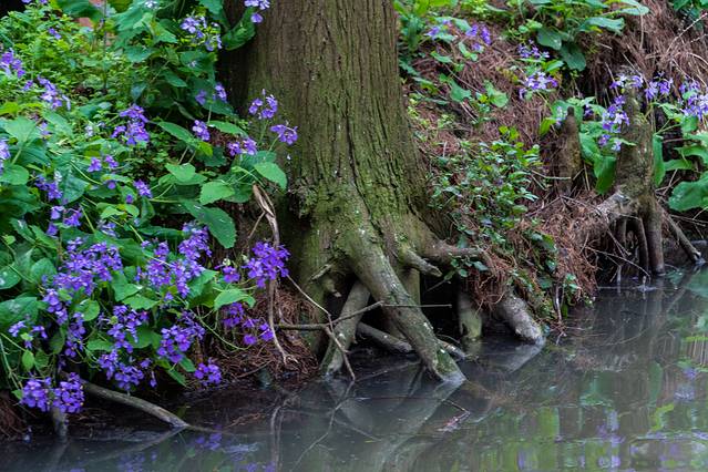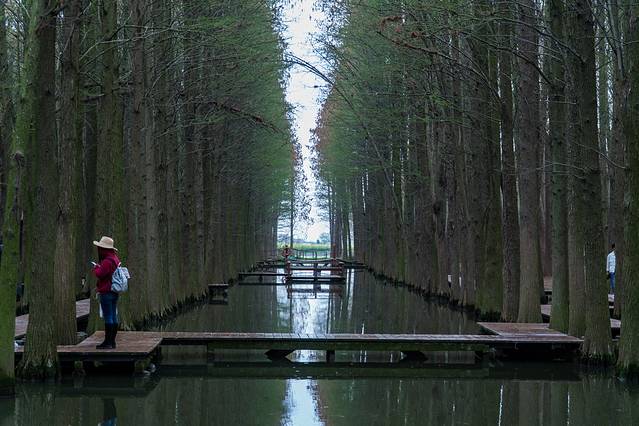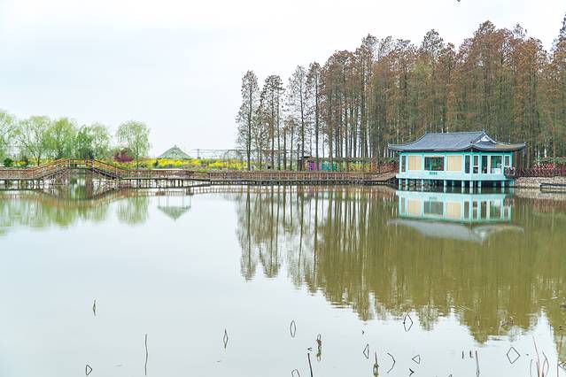 这里栽种了各种池杉、水杉,有10万余株,高大茂密。林中间还种了很多经济作物,比如油菜、芋艿等。水里还养了鱼虾。随处可见的裸露在水面上的树根,据说是天然根雕,很有价值!