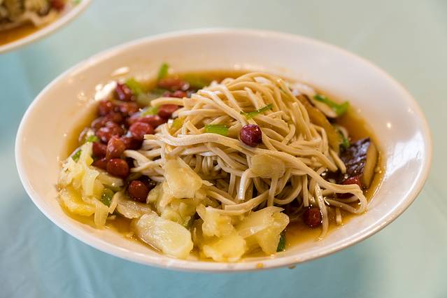 这里要说说兴化早茶文化里的不同之处。早茶里有煮干丝(咸味),但是每桌每人都会必点一道叫烫干丝(甜味)的菜。本地人称之为茶头,意思是吃早茶的开始。如果你胃口好,吃完茶头、点心,还可以再来一碗阳春面!