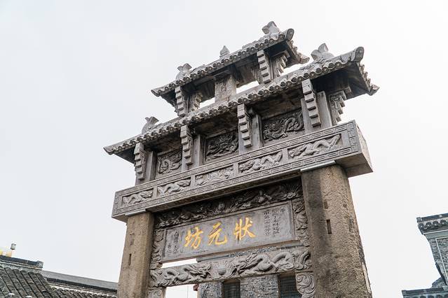 向北伸展的状元巷,是明嘉靖年间状元李春芳早年生活的地方。地方志称此地为“明少师李春芳读书处”。状元巷头跨街的石牌坊,始建于明嘉靖二十六年(一五四七),单门双柱。
