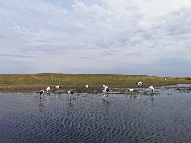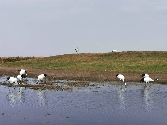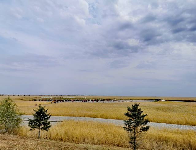 鹤群放飞表演是扎龙景区的特色看点,每次大约放飞20-30只丹顶鹤。你会看到远处的一群丹顶鹤在放鹤人的挥杆引导下开始助跑、飞翔,在空中盘旋片刻后飞回放飞处。到达景区建议先注意看一下放飞时间的公告,赶时间的话可以直接坐电瓶车至终点站,然后步行约20分钟至放鹤栈桥等待放飞。
