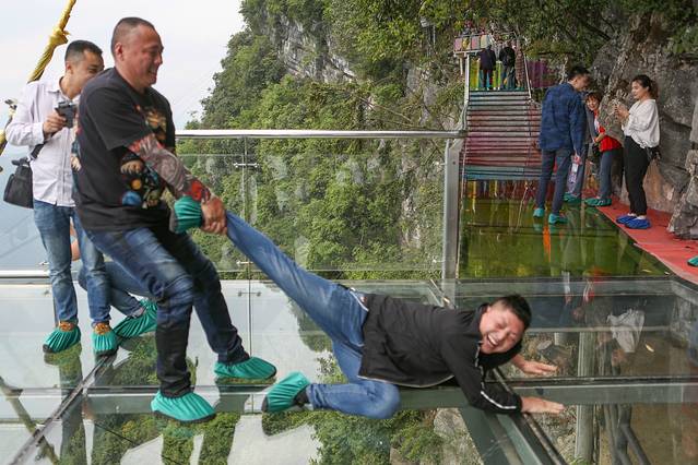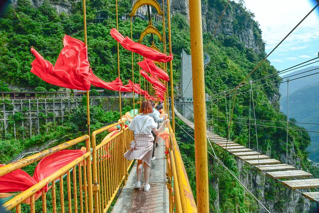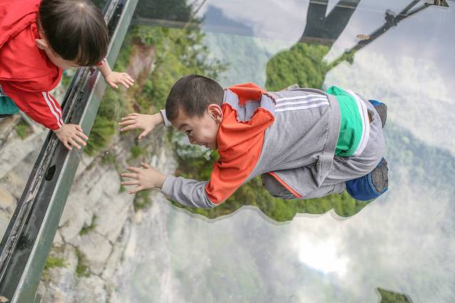 玻璃桥通体由玻璃铺设,只是轻轻一步站上去,立刻就能体验到胆颤心惊的感觉,然而有的人却能在这种体验里找到战胜恐惧的快乐,从而放开心扉欣赏这山间的美景。