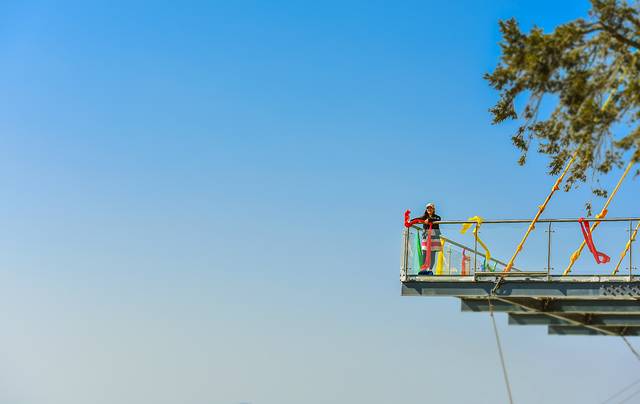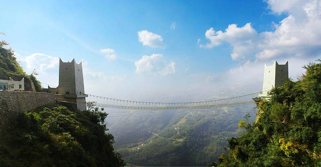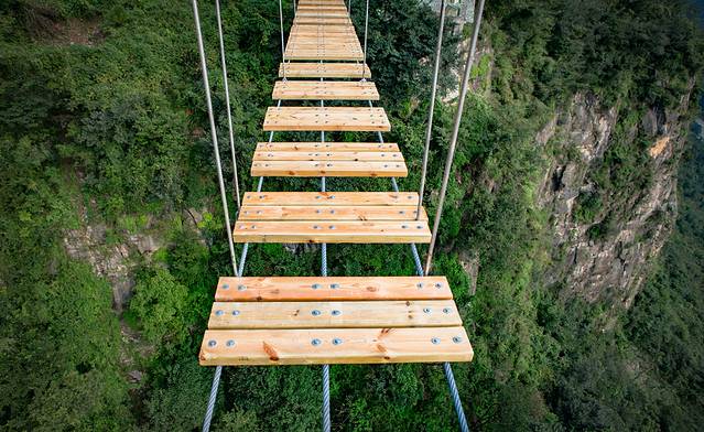 想要挑战自我的人,他的双腿总是不受控制往“云中漫步”上面拐。要我看来,这几块稀稀拉拉的木头、几根钢索。换我肯定是敬谢不敏,你敢挑战吗?