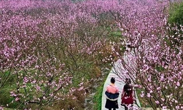 桃花谷正式赏花好时节,步道蜿蜒曲折别具风情,桃红柳绿竞相争艳。