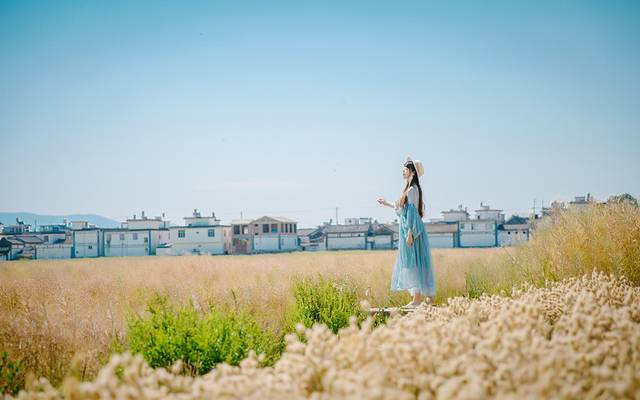 还未进城,面前便是一大片油菜花田,听说3月底的时候开满了金灿灿的油菜花,搭配上大理的治愈系天空美成了仙境,虽说现在花期已过,暗黄的色调看着稍微有些荒芜,却让这里多了一份静谧的美。