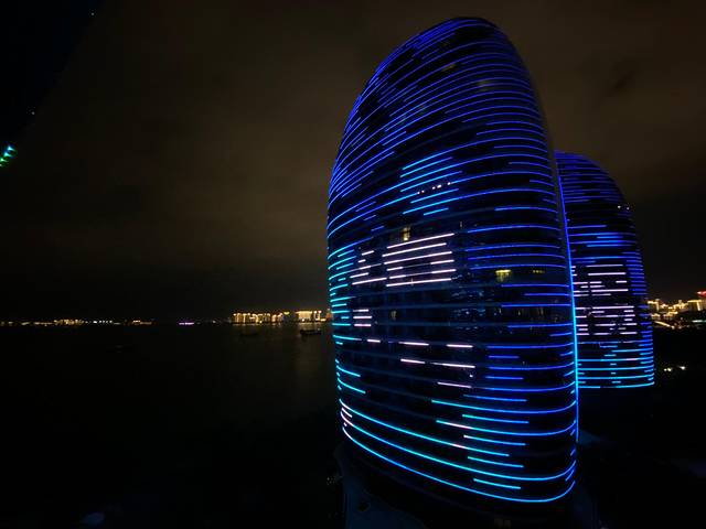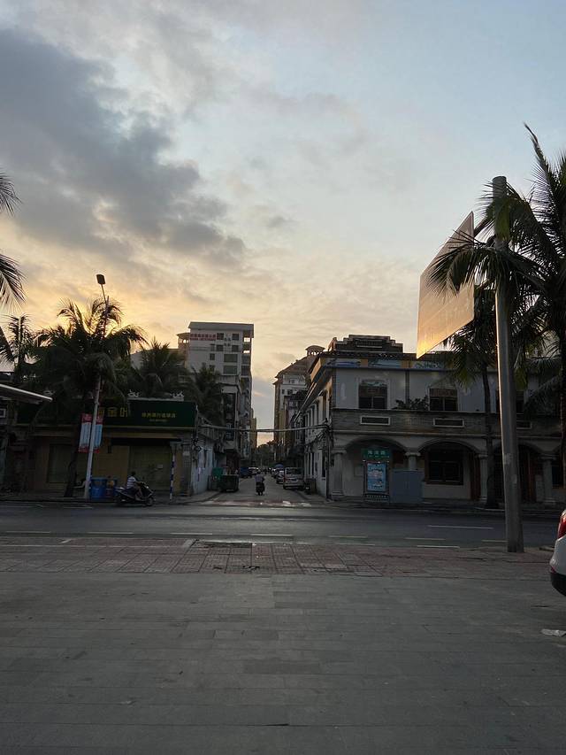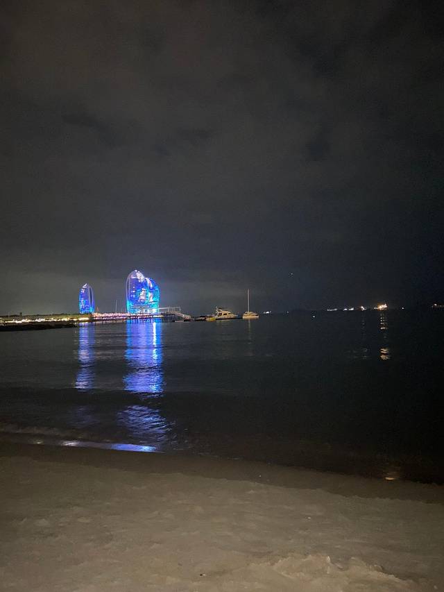 接着我们就继续出发去了三亚,快到三亚的时候已经能看到太阳了,尽管已经快要落山了。中途离天涯海角很近,明知道景区快关门了还是绕道去看了下。到了那里一下车,明显又感觉到一股热气流扑面而来,景区已经停止售票了,我们在门口拍拍照就离开了。到市区的时候已经八点多了,我们找了一家位于凤凰岛的海景房,中途路过海滩,看见好多人在散步,就停下来坐了会儿。这里晚上海边的夜景也很美,城市不喧哗,海边三三两两的坐着几对人。