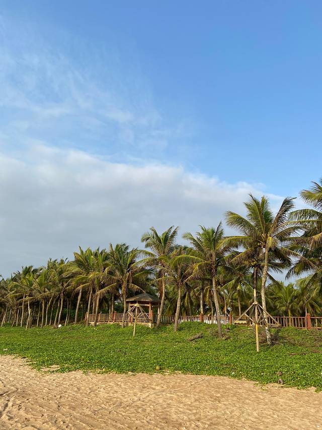 上午的时候去了椰梦长廊,发现就是我们昨天晚上所在的海边。绿水蓝天,椰子沙滩,随便一拍就想画一样漂亮。太阳有些晒,但是时不时的凉风让人不觉得那么热。看到这么漂亮的海的他忍不住想下去游泳。我们在路边超市买了拖鞋和短裤(有点小贵),然后他就下海去了,游了不到五分钟就上来了,说是水太咸了,哈哈哈哈哈·····