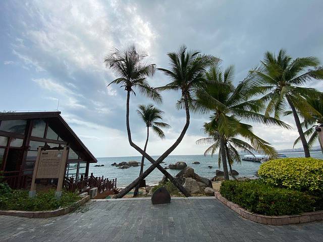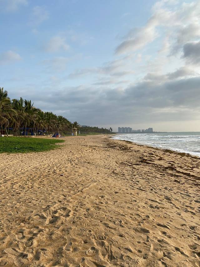 中午吃完饭,我们启程去三亚,中间绕道经过海花岛。海花岛是由恒大建造的一座人工岛,非业主不能上岛,我们只能远远眺望。海花岛周边的沙滩景色也很美,绿化面积大,有好几组人在拍婚纱照。这里海滩边的沙是白色的,砂砾大,会硌脚。