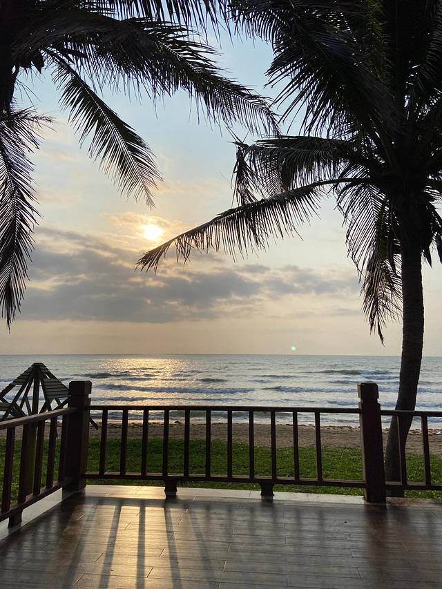 伴随着不太耀眼的阳光,一会儿飘来了一阵毛毛雨,来得快,去得也快。我们就在海边悠闲地坐着,买了两块本地人卖的菠萝,超甜的。