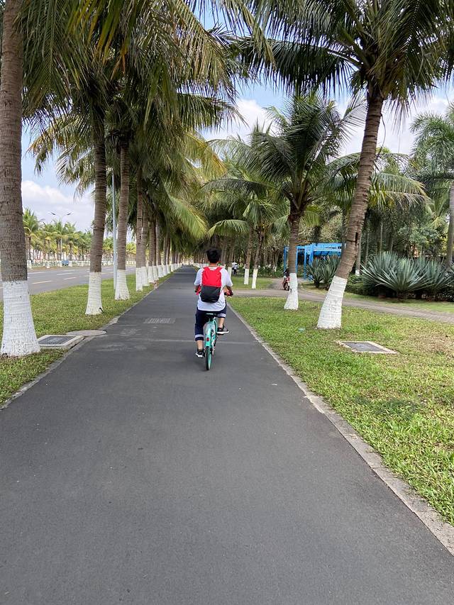 吃完饭就打车去港口车站了。跟出租车司机聊天问他为什么海南与内地之间为什么没架桥,他说肯定不是因为差钱,原因很多呀…然后就一个也没说出来。南方人说普通话也挺萌的。到车站时间还早,我们一看地图,这边离西秀海滩很近。so就一人扫了辆车往西秀去了。今天的海口是个好天气,骑着车会感觉出汗,停下来吹吹风很凉快。蓝天白云,椰子大道,一尘不染的公路,这是海南独特的美。