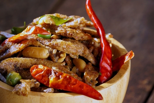这是一种炸至香脆的小鱼小吃, 整一条都能入口。 作为小吃,这样的炸鱼也可以保存很长时间,而且除了辣味,还有许多不同口味可供选择。