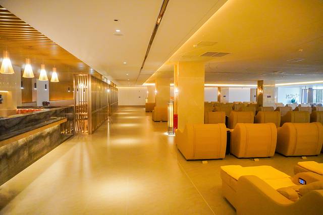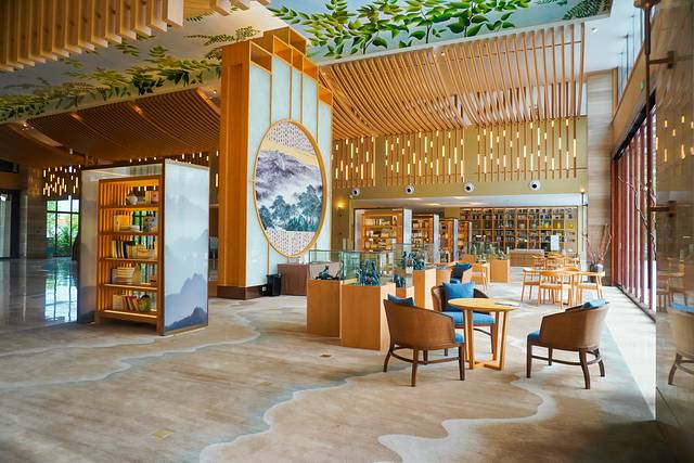 造型独特的屏风把大堂和大堂吧相隔分开,简约的休息桌椅,大气的装修格调,显得低调又奢华。一旁的书柜琳琅满目的摆放着各种书籍,让休息的客人也不会觉得无聊,温馨的光线让整个空间恰到好处的舒适。