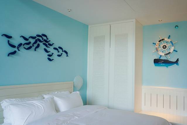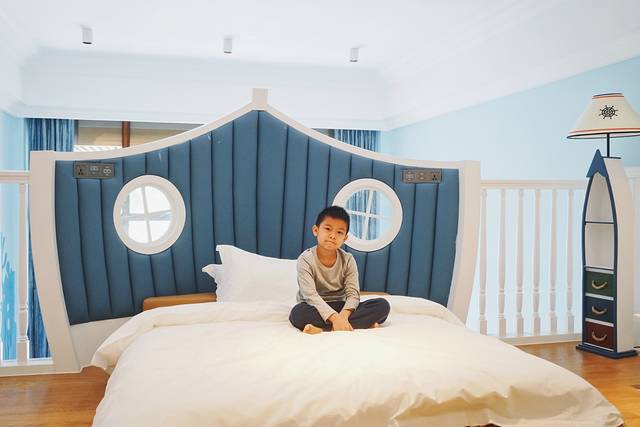 说到亲子度假,那不得不提亲子房了。我们入住的是一间海洋亲子复式主题房,楼下为大人房,带干湿分离洗手间。楼上为儿童房,同样带干湿分离洗手间。初次见恬静的蓝色,满是海洋元素的背景瞬间给人一种放空的感觉。