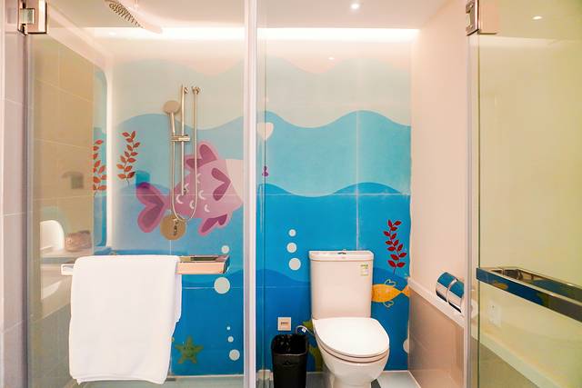 洗手间的装饰也是满满童真,墙上在游动的小鱼,吐出的泡泡,这样的场景我想每个小孩子都喜欢在里面洗澡吧。洗簌台给孩子们准备的洗簌用品也是童心满满的,看到这些有趣的东西,就连大人的孩子心都要爆发出来了。