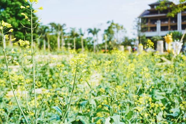 在森林海温泉度假酒店,就有这样一个田园,种了应季的蔬菜。田里长满了油菜花,此时正是油菜花盛开的季节,田里一片金黄,煞是好看。