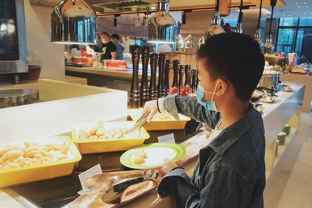 这里的早餐也真的太丰富了,广式点心、粉面、面包、水果等等,中西式齐全,几十个品种让你看得眼花缭乱,孩子们见到也乐坏了,拿起碟子往自己喜欢的食物走去~