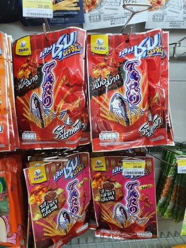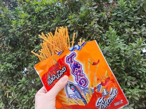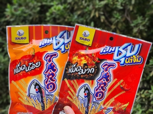 这是我非常喜欢的零食,首屈一指。它们由100%鱼肉制成。跟其它品牌的鱿鱼丝不一样,因为我吃的时候一点面粉感都没。很有特色的是,这款烤鱼丝出了蘸酱辣味系列。但是!大家不用怕,不喜欢吃辣味的朋友也可以吃,因为分别为4个辣度:超辣味、微辣味、泰东北酸辣肉末沙拉味(会感觉到泰式风格的美味)和四川麻辣味。这个零食不能错过,每个味道真好吃。