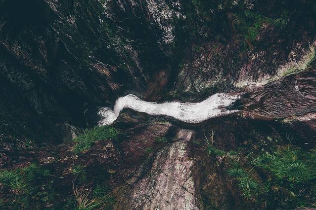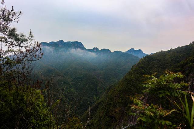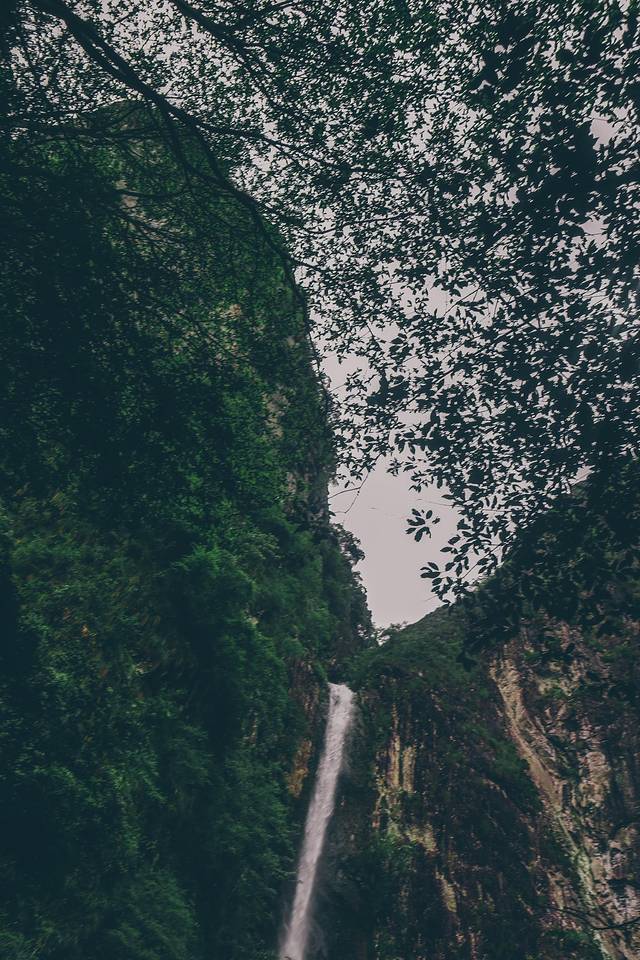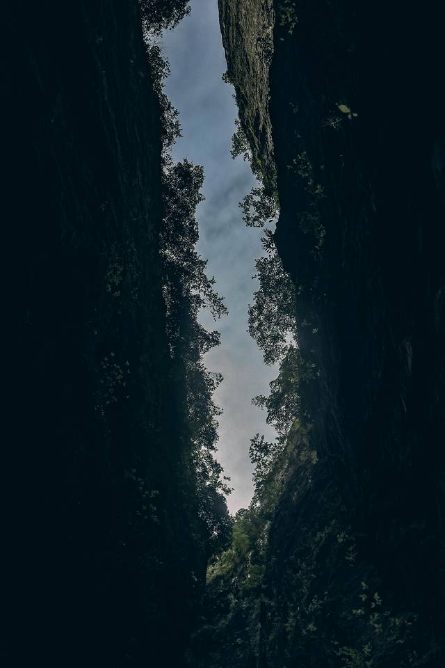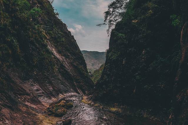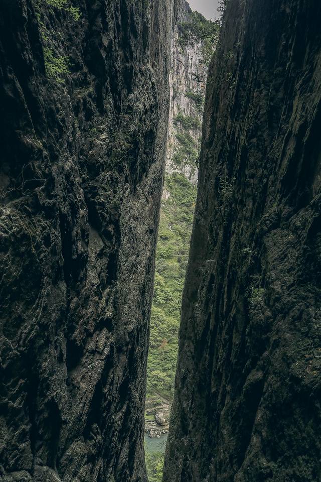 一线天隐没于山峡之中,行走于一线天内,宛若处于《桃花源记》中渔人前往桃花源所历经的步道,沿途曲折寻幽,青树翠蔓,回头向山下望去,隐隐约约还能望见山脚的金珠瀑,抬头朝山顶望去,骆驼峰顶端的爱洛斯云廊也是若隐若现......