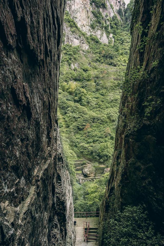 从金珠瀑的左侧步道登山,我们可以遇见一个不一样的 永嘉 书院,狭长的登山步道韵味有别于 永嘉 书院内的其余风景,这正是一线天登山步道。