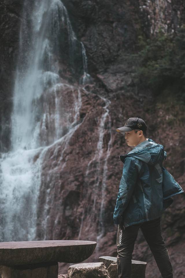 再次得以来到出口,这次所见的景观颇为艳丽,树林间,枫叶乍现,一片绿叶中出现些许火红,其景致不输一些名山大川,到了这里,便是下山的路途了,而在下山途中,我们还偶遇了一大瀑布,同瀑布合个影,又酷又得劲儿!