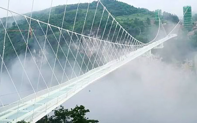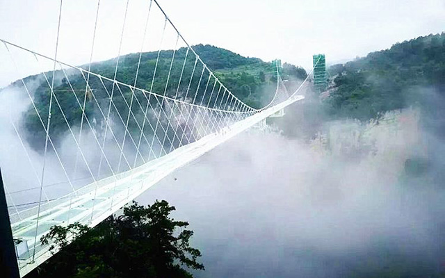 如果你以为这只是普通的峡谷索桥,那你就错了!这座桥的桥面全部采用透明玻璃铺设,整个工程无钢筋混凝土桥墩。它完全透明,横跨两山之间,脚上脚下全是景,是世界上最长、最高、全透明玻璃桥!