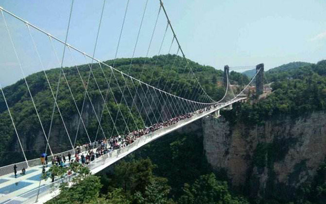 胆小的扶墙一族慎入啊,因为在这座桥上你完全没有墙可以扶!它主跨430米,桥面长375米,宽6米,桥面距谷底相对高度约300米的。除了最长和最高,它还被CNN列入世界11座最壮观的桥之一。 张家界大峡谷玻璃桥是由以色列国际桥梁建筑设计大师采用了中国传统元素设计而成的。设计理念来自老子《道德经》里的美学观点:“大音希声、大象无形”。