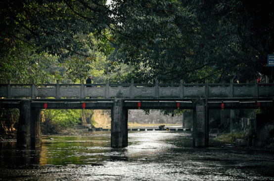 酒足饭饱,我们在古镇闲逛,偏岩古镇是重庆十大古镇之一,但与我们以前去过的那些古镇又很不同。去偏岩前,这个北碚的古镇,在我的印象中,绝对不应该是这样一副小桥流水的江南情调。然而,当我走上那条连接新街与老街的小石桥,看着清澈的小河,还有河边那些葱郁的古树,我几乎要怀疑自己是否正置身于某个江南的水乡了。在这里,人不多不少,路不窄不宽,青石板街、小桥流水,一切都刚刚好。