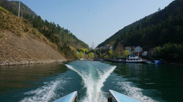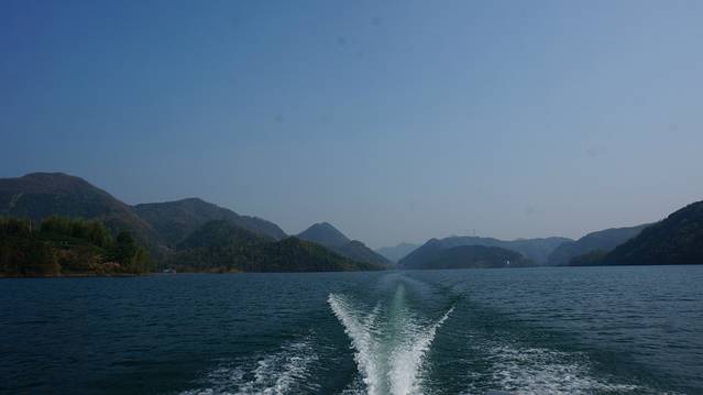 游船在湖面上留下白色的浪花,四周的山上是层层的竹海,风一吹过,沙沙作响。