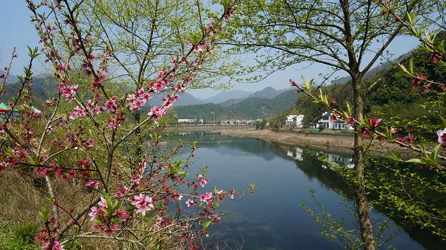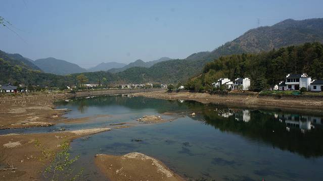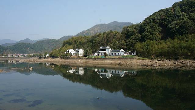 河边绿树垂绦,掩映着白屋,水天一色,倒影在河水中,分不清谁是谁的影子......青山绿水,我们的车好像行驶在一幅长长的中国山水长卷中。