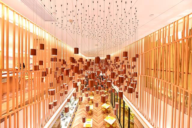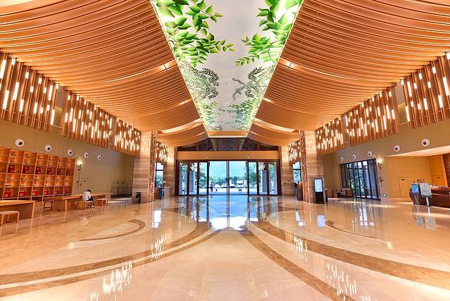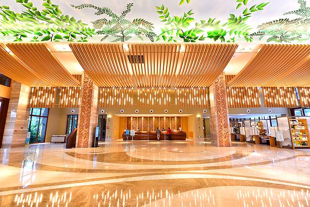 酒店大堂结合地域文化特色,将森林景观引入;地面用陶艺碎拼水纹流向,大堂天花由造型木条延伸,顶上是叶子绘画,形成花木繁华景象;柱子的艺术叶子图案,与空间相辅相成,赋整个大堂以灵动、温馨。