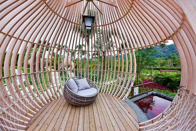 最受欢迎的要算这个树屋温泉了,整个设计如掩映在丛林的鸟巢,美观独特又与环境融为一体,通过楼层的设计既有很好的隐私清净空间,同时将美丽的风景尽收眼底。