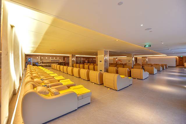 大堂中间设有长型案几,大堂与大堂吧之间设有造型屏风,书柜琳琅满目的摆放着各种书籍,在等待或者休息时不会觉得无聊,温暖柔和的光线和落地玻璃窗的设计使整个空间变得更温馨舒适。