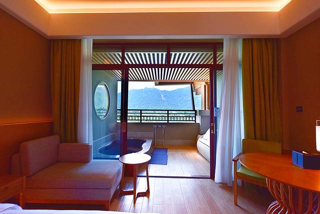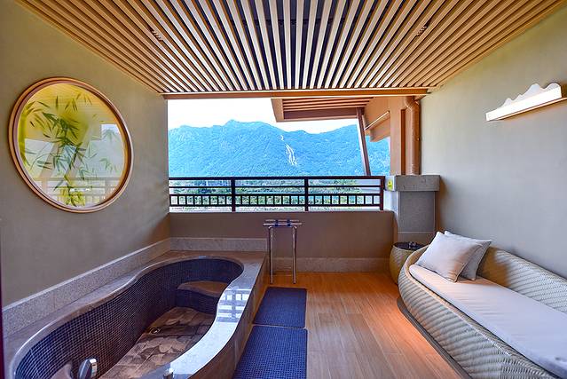 带着一份期待来到阳台,惊喜地发现这里为你私藏了一处180度河谷美景,放眼望去,青山群峦,满目苍翠, 白水 仙瀑从山中倾泻而下,同时私享一池热汤,一流的景色加一流的私家温泉,不用出房门就能享受悠然自得的泡汤时光。