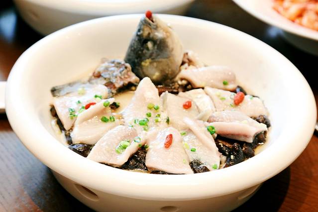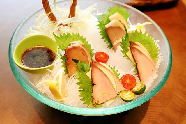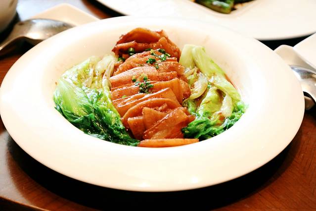 花雕汁浸雪糕冻鹅肝,口感十分鲜嫩。鹅肝是用花雕和大厨自己调制的酱汁,低火慢慢浸熟的,再放入冰柜冷藏2-3小时。制作费时,所以每天限量供应,只有四五份,吃到就是赚到。